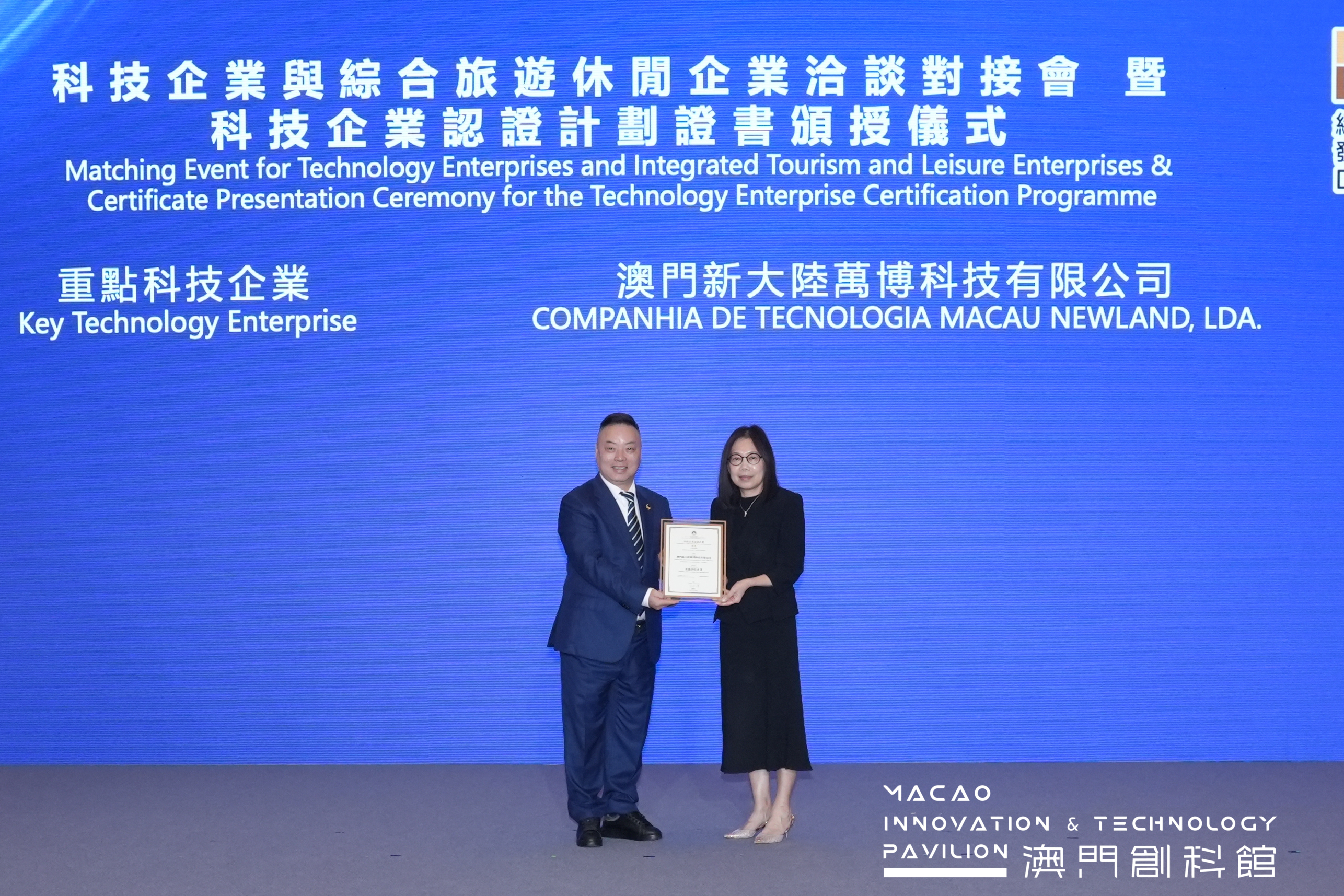 12月5日,由澳门特区政府经济及科技发展局(下称"经科局")和科学技术发展基金共同主办的"科技企业与综合旅游休闲企业洽谈对接会暨科技企业认证计划证书颁授仪式"在澳门威尼斯人酒店举行。经过严格筛选与评审,澳门球速体育万博成功获评为《科技企业认证计划》——"重点科技企业"。经科局代局长郑晓敏为获认证企业颁奖,公司总经理刘金东出席仪式并领取证书。