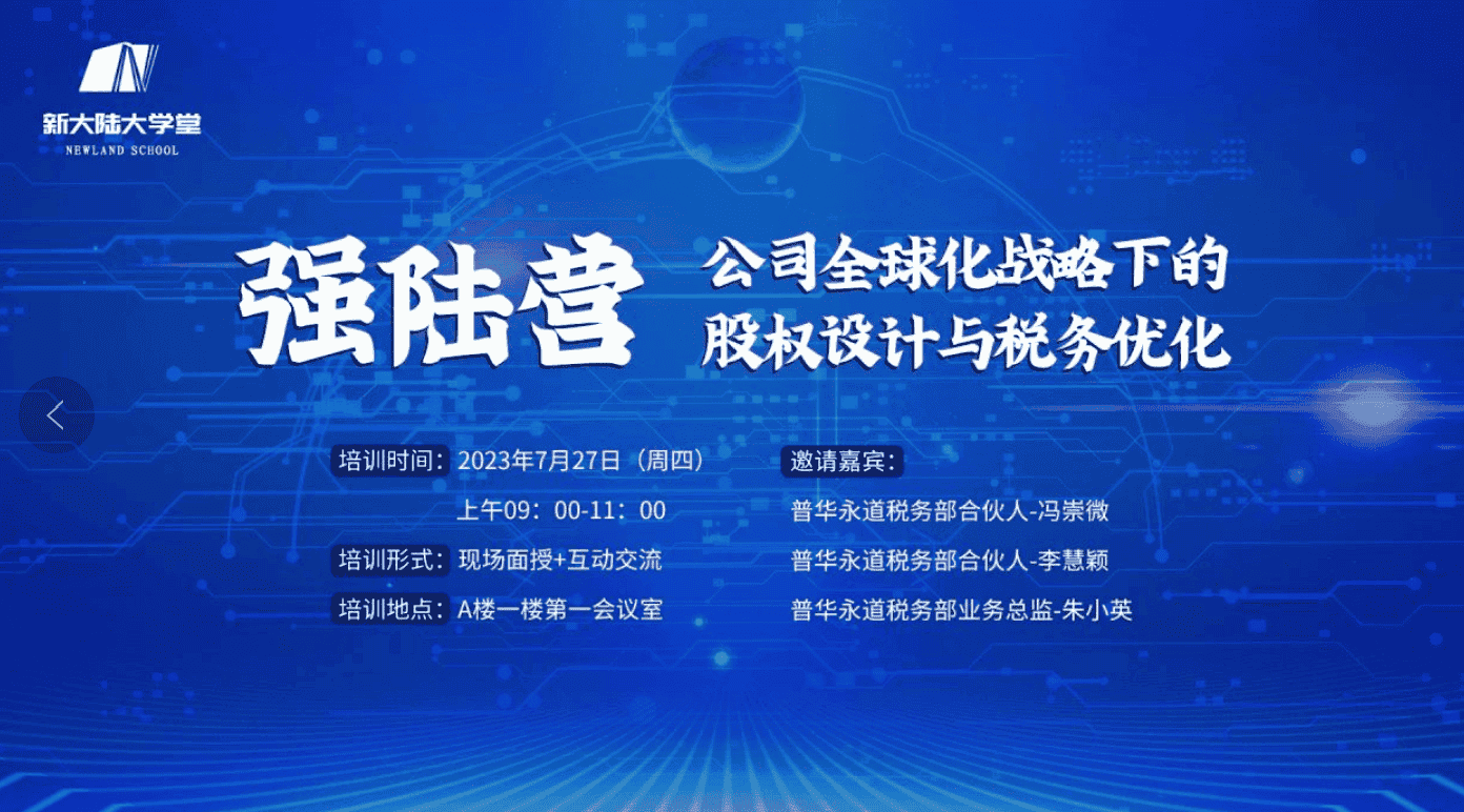 为增强公司相关人员对国际税收整体筹划的了解,推动构建公司全球化战略的股权设计与税务优化的规范体系,为公司海外战略布局提供有力支撑。7 月 27 日,在支付公司的推荐下,集团人力资源部与股份公司财务部联合特邀国际会计师事务所普华永道的合伙人李慧颖、朱小英,带来球速体育强陆营 “公司全球化战略下的股权设计与税务优化”分享培训会,来自集团总部职能平台及各经营单位67位有关海外业务、财务、投资的人员通过线上线下参加。