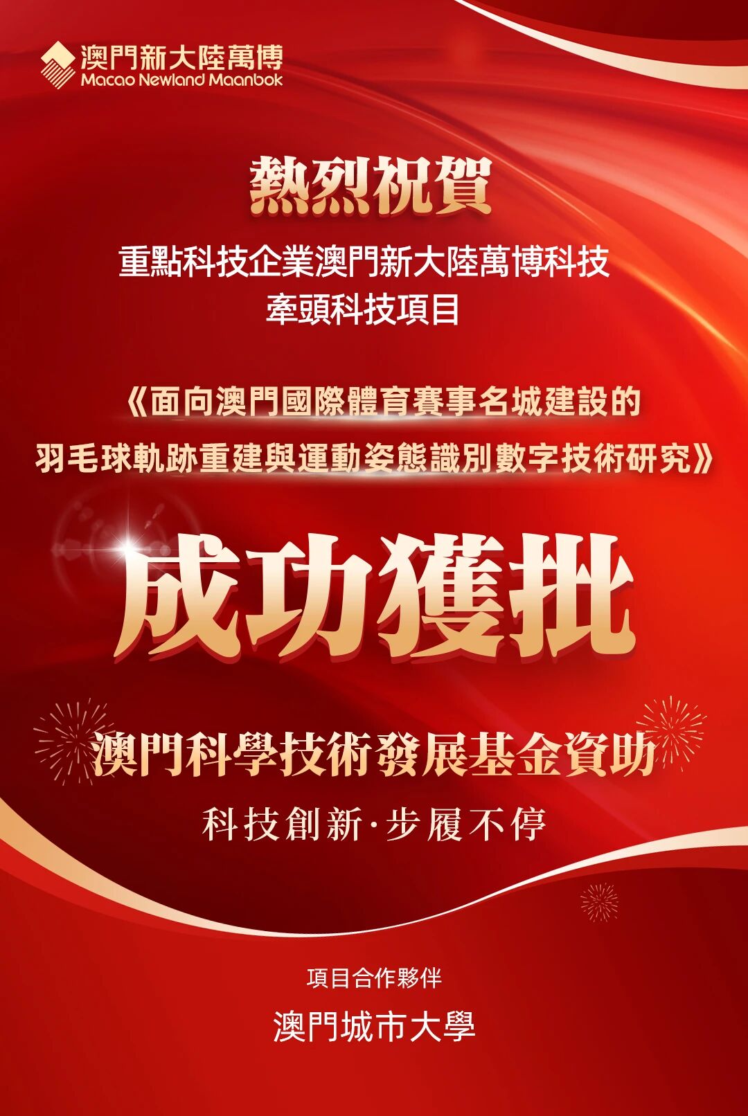 近日,由澳门特区政府重点科技企业 —— 澳门球速体育万博科技牵头,联合澳门城市大学共同研发的《面向澳门国际体育赛事名城建设的羽毛球轨迹重建与运动姿态识别数字技术研究》成功获批澳门科学技术发展基金资助。